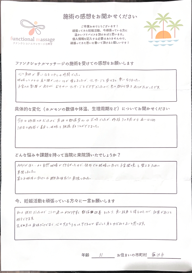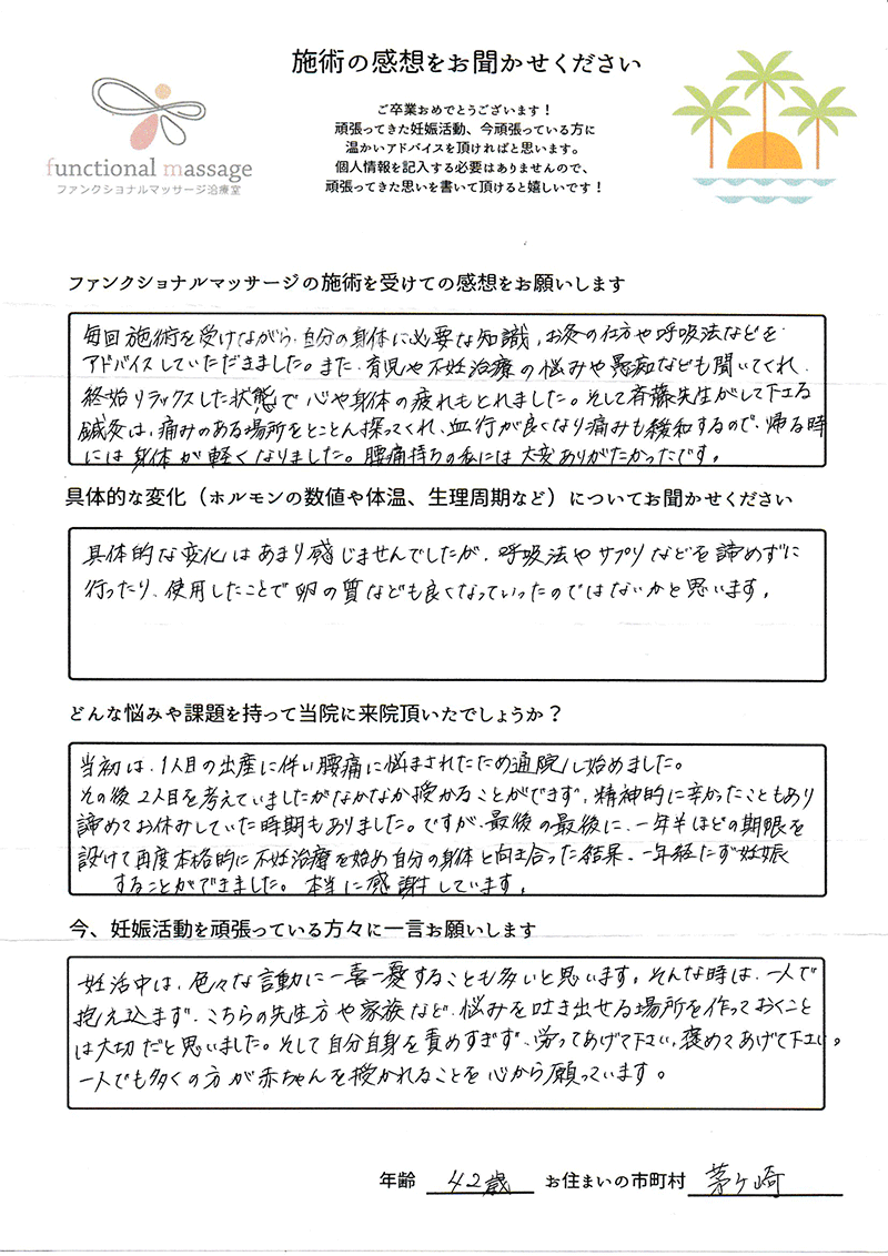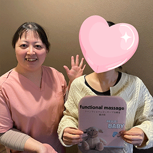 41歳での自然妊娠ですが、一度流産も経験しており、毎月また生理きたのねという日々もありました。うまくいくことばかりではありませんがファンクショナルマッサージの皆さんにはいつも明るく優しく接してもらい、とにかくここに来ると前向きな気持ちやリラックスした時間を過ごせるので私の妊活には絶対に必要な場所でした。
