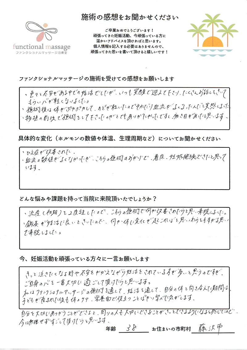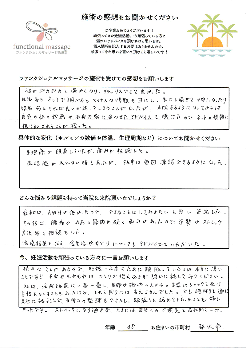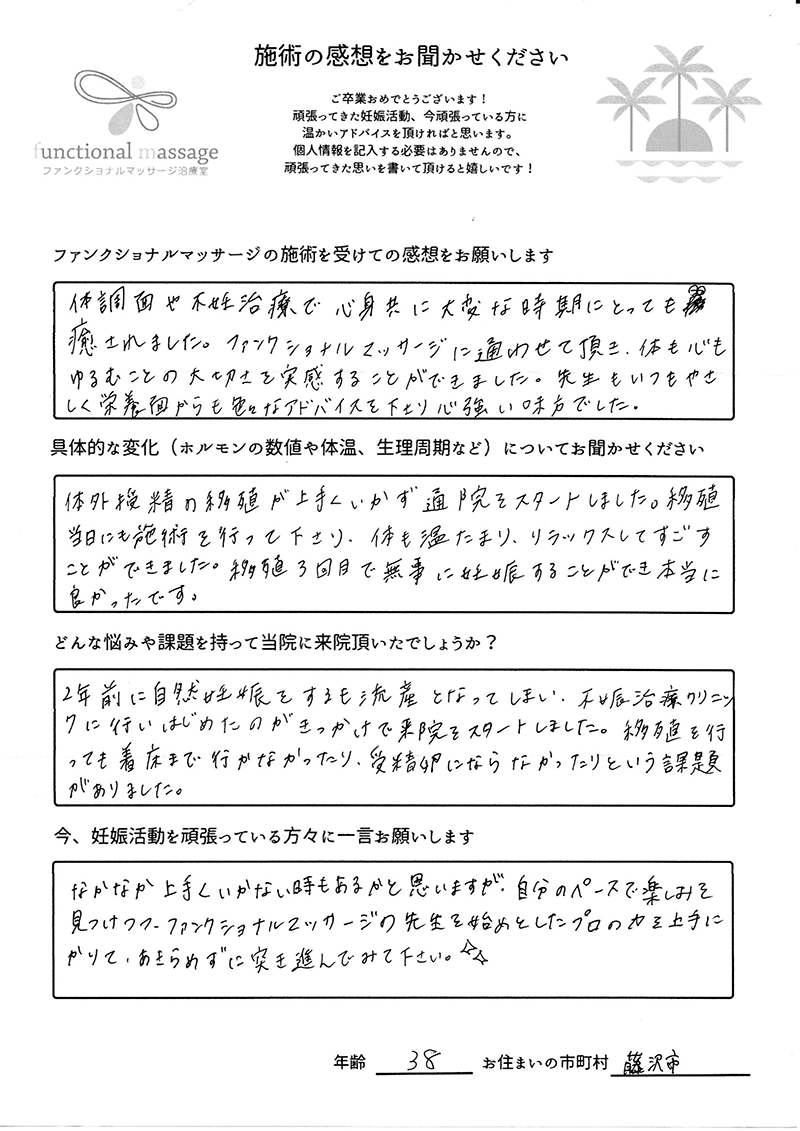 絶対妊娠する!!という気持ちとストレスフリーで生活し、ファンクショナルマッサージの皆さんにもたくさん協力してもらって頑張って下さい。