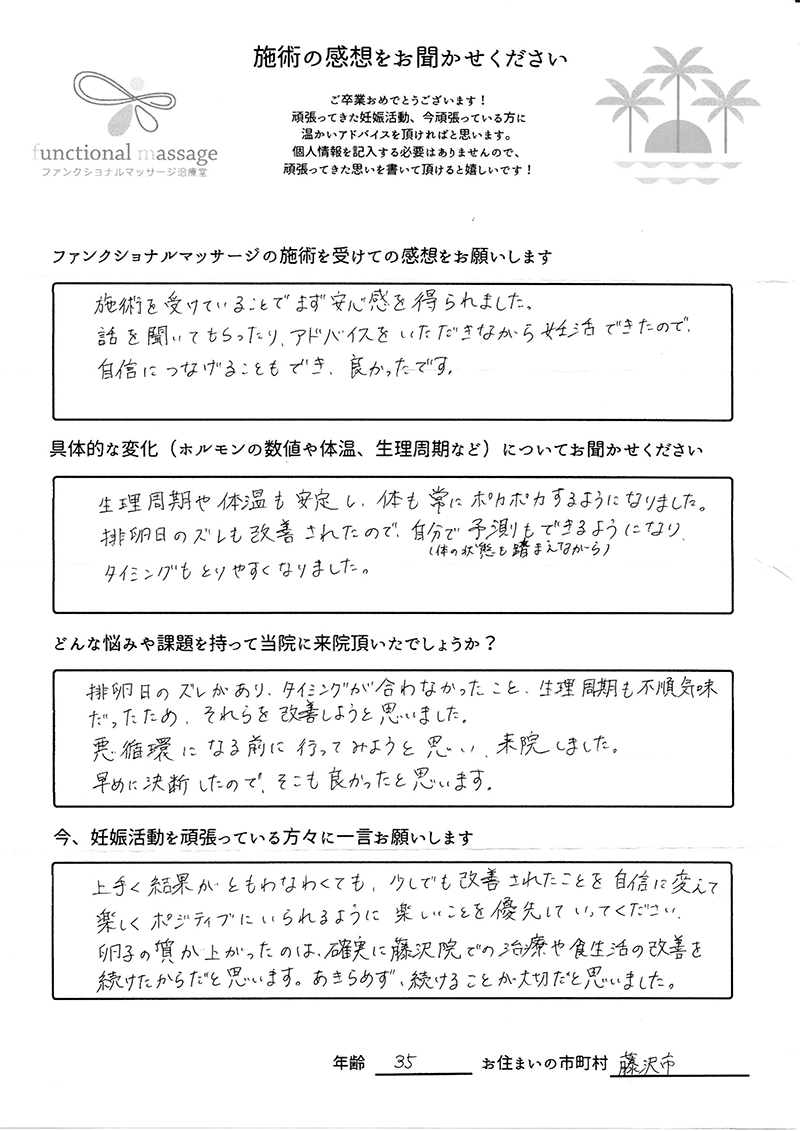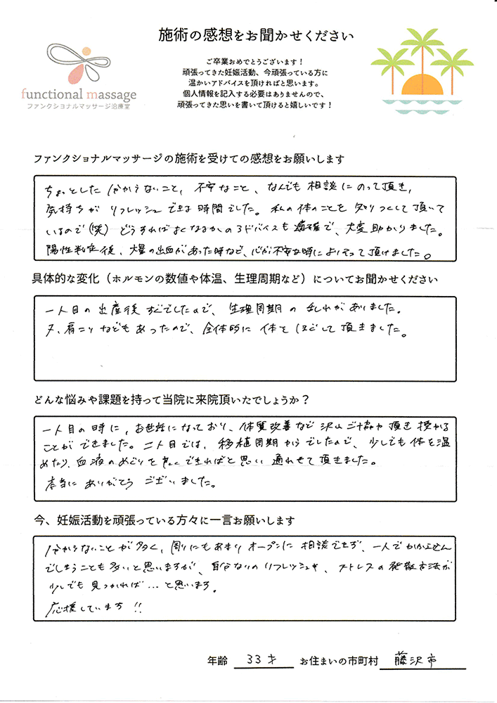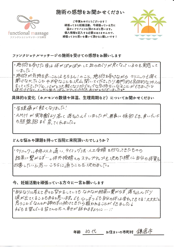 スタッフの方もポジティブに状況を受け止めてくれて、毎回楽しく通うことが出来ました。子宮を温めることで血の巡りが良くなったと思います。