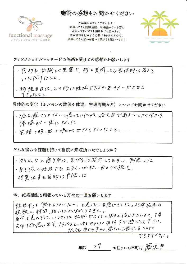 ファンクショナルマッサージ は妊活に絶対必要な場所だと思ってます。先生の言う事をよく聞いて自宅でお灸を続ける事で妊娠というゴールはとても近くなるハズです。あきらめず前向きに楽しく妊活できるよう応援しています!
