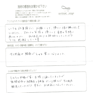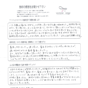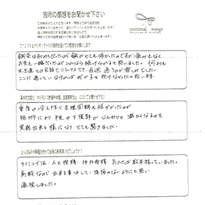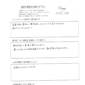 施術をうけいつも体、心共に癒されていました。施術中に教えていただいた事、アドバイスがどれも丁寧も教えていただき、納得しながら試していくことができました。