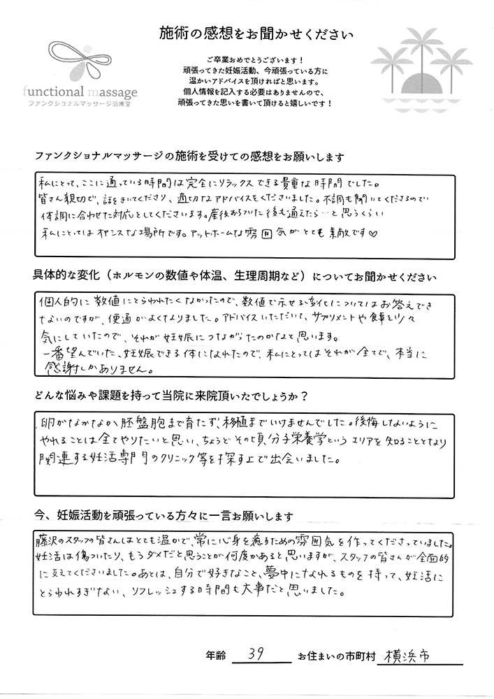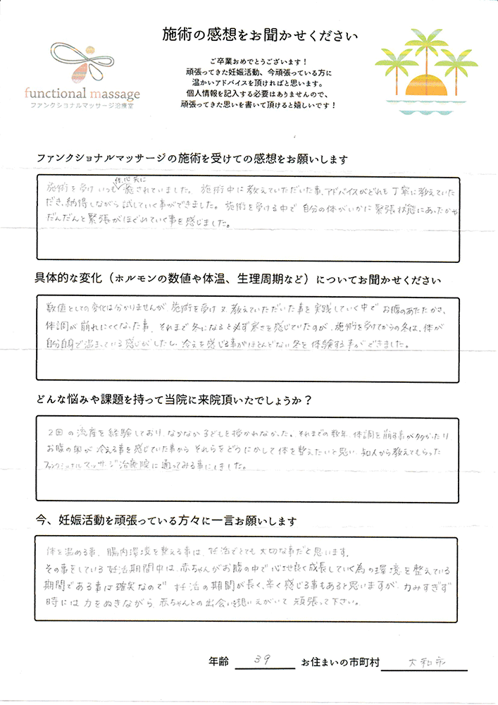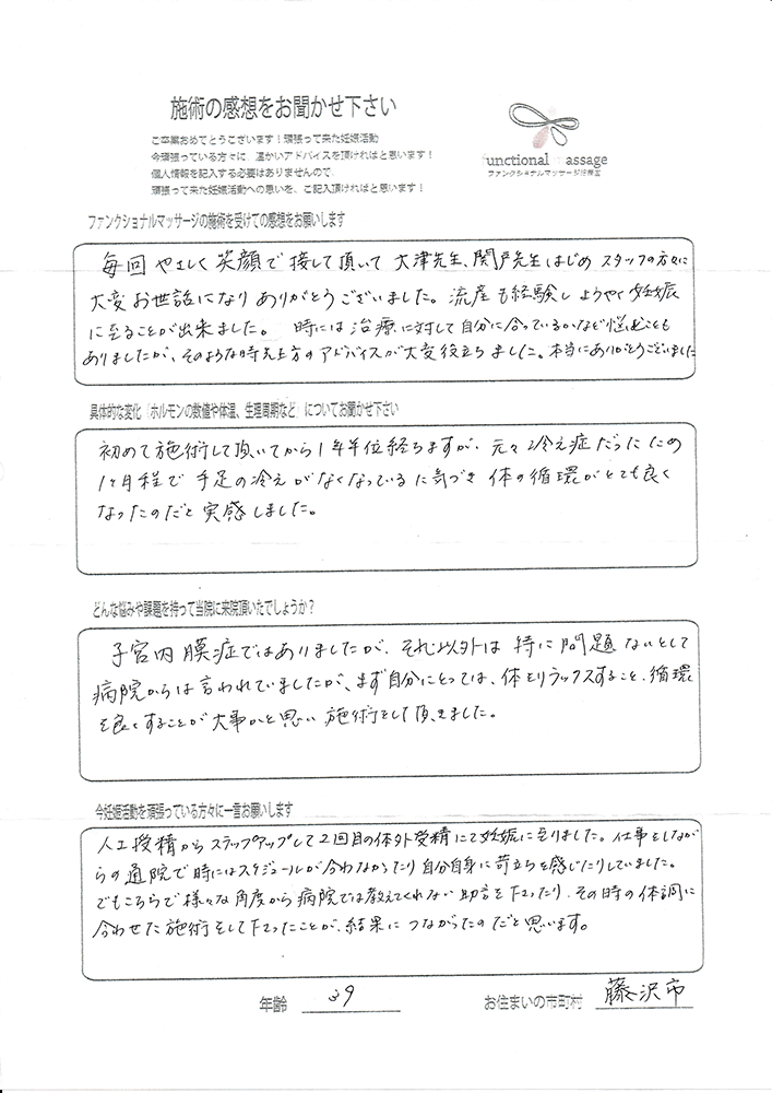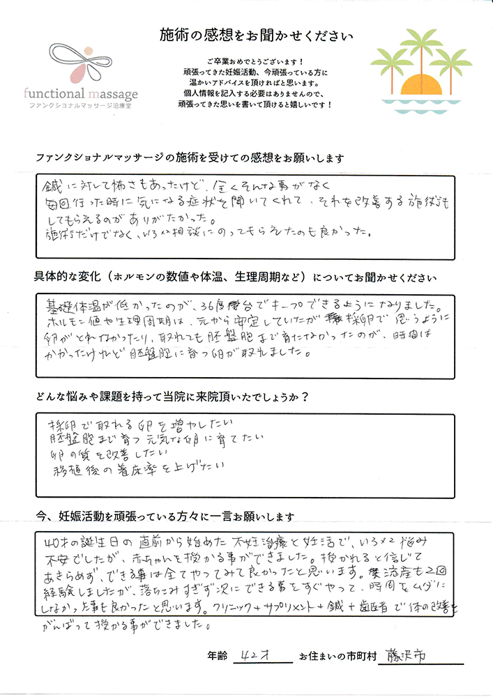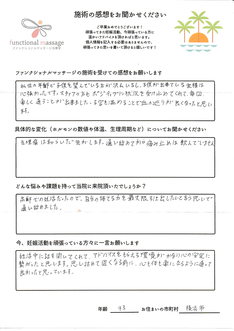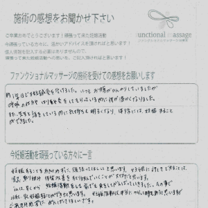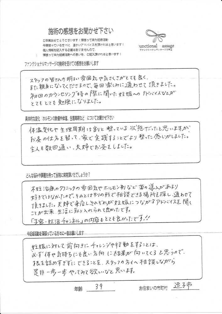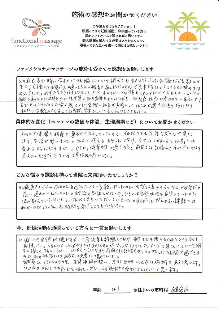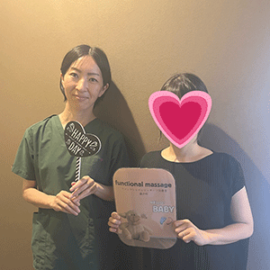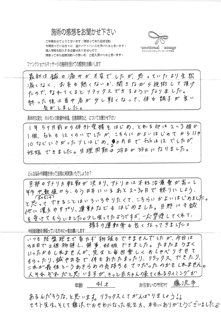 41歳での自然妊娠ですが、一度流産も経験しており、毎月また生理きたのねという日々もありました。うまくいくことばかりではありませんがファンクショナルマッサージの皆さんにはいつも明るく優しく接してもらい、とにかくここに来ると前向きな気持ちやリラックスした時間を過ごせるので私の妊活には絶対に必要な場所でした。