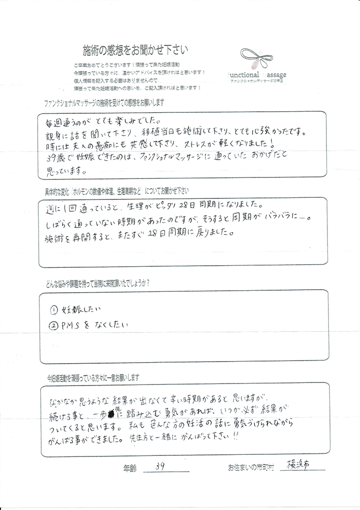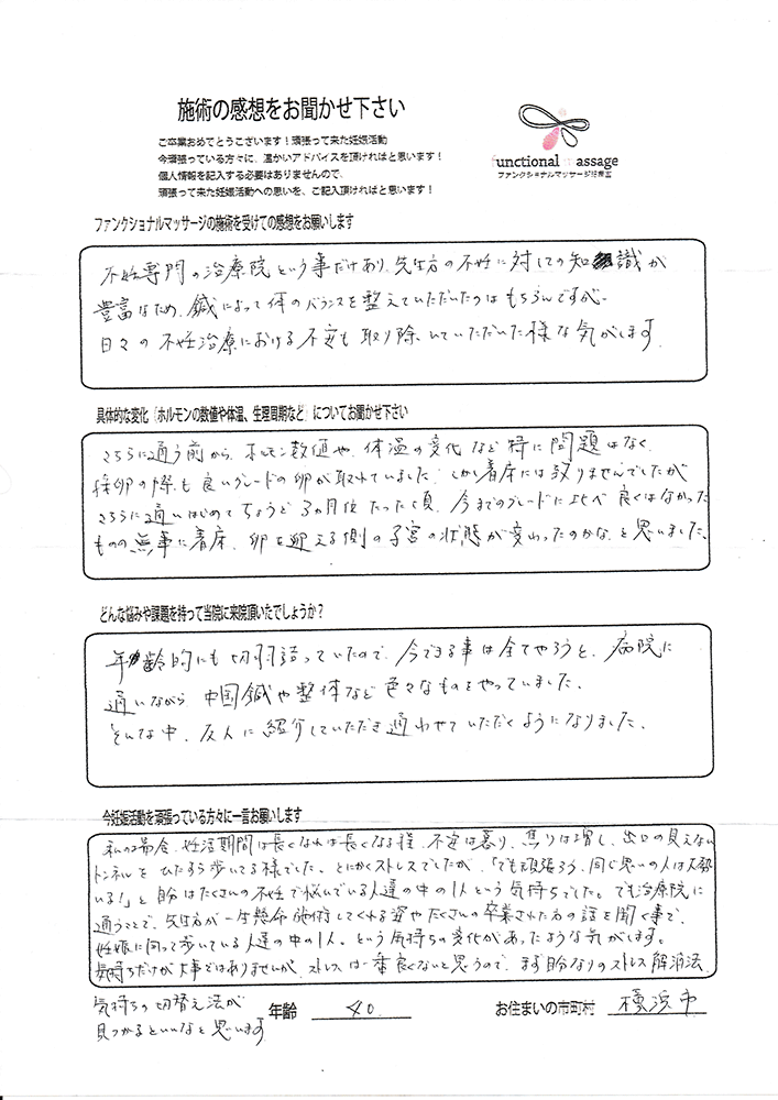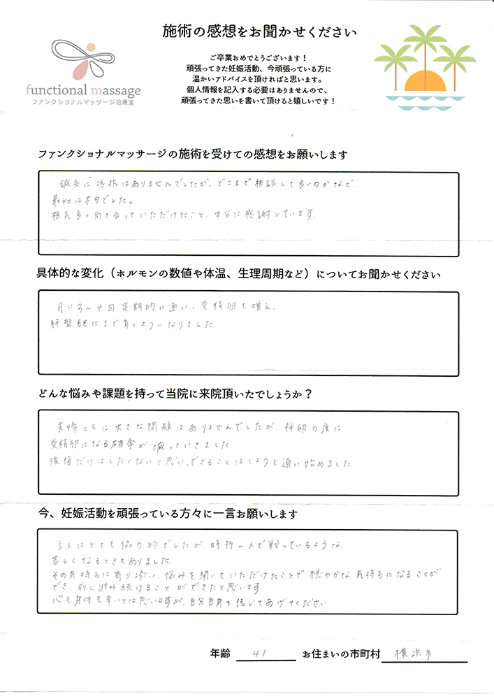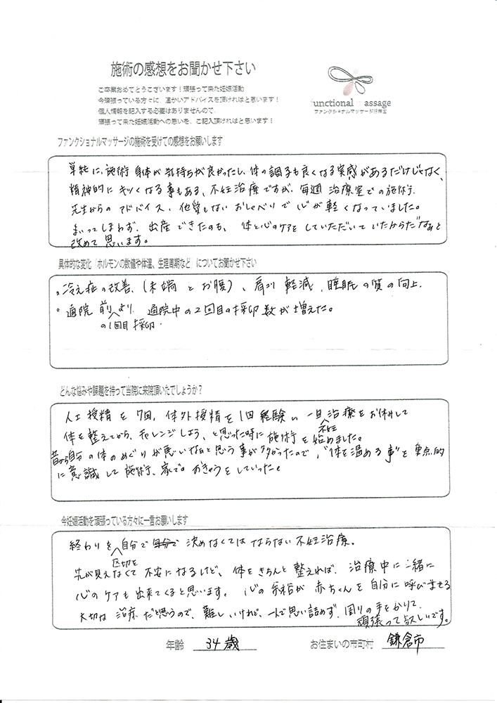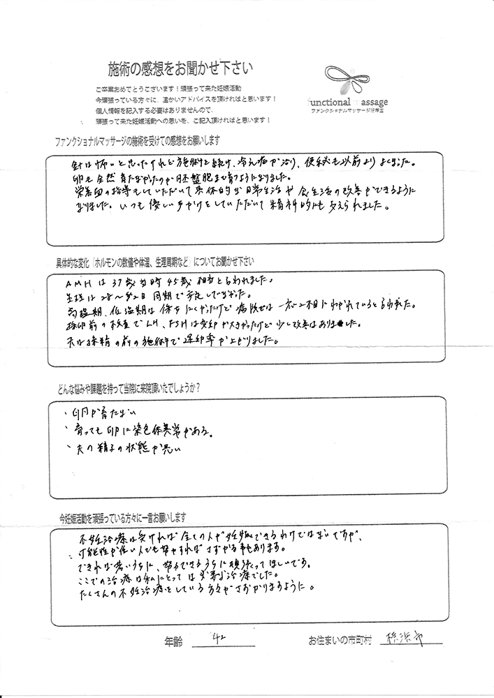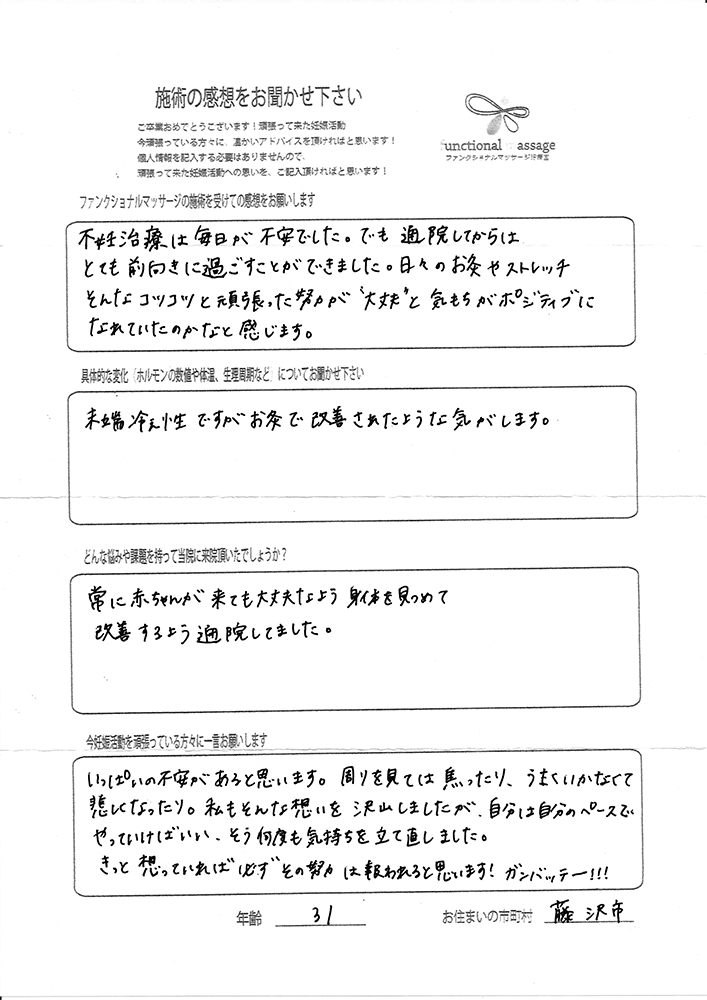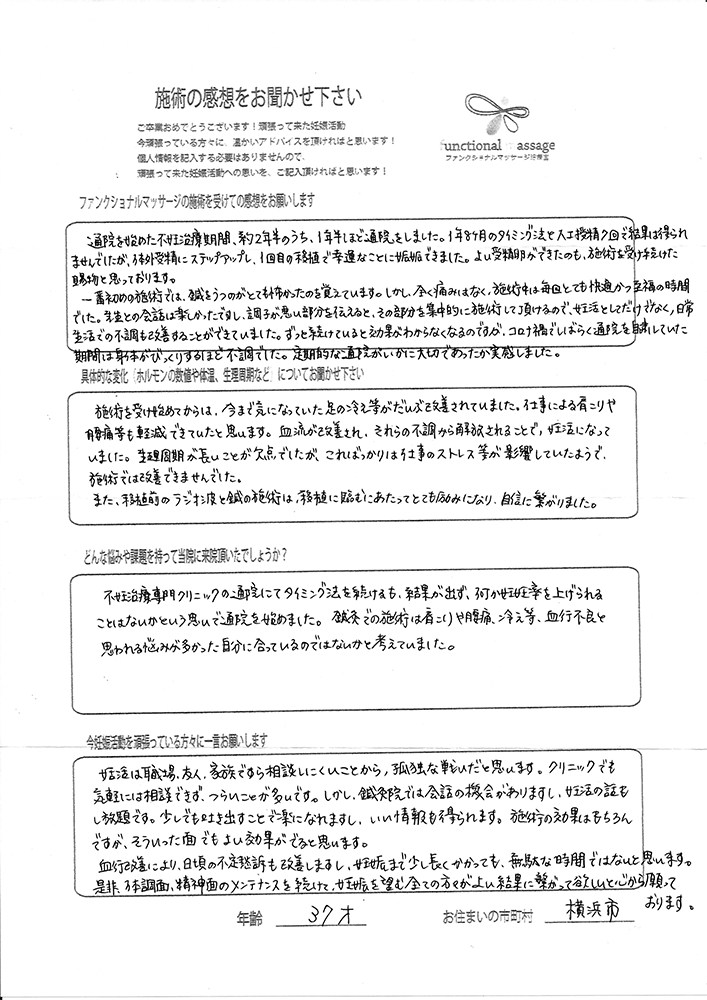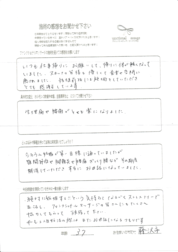 41歳での自然妊娠ですが、一度流産も経験しており、毎月また生理きたのねという日々もありました。うまくいくことばかりではありませんがファンクショナルマッサージの皆さんにはいつも明るく優しく接してもらい、とにかくここに来ると前向きな気持ちやリラックスした時間を過ごせるので私の妊活には絶対に必要な場所でした。