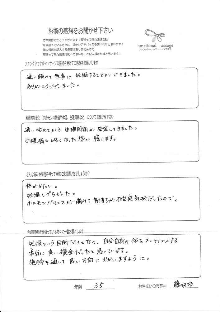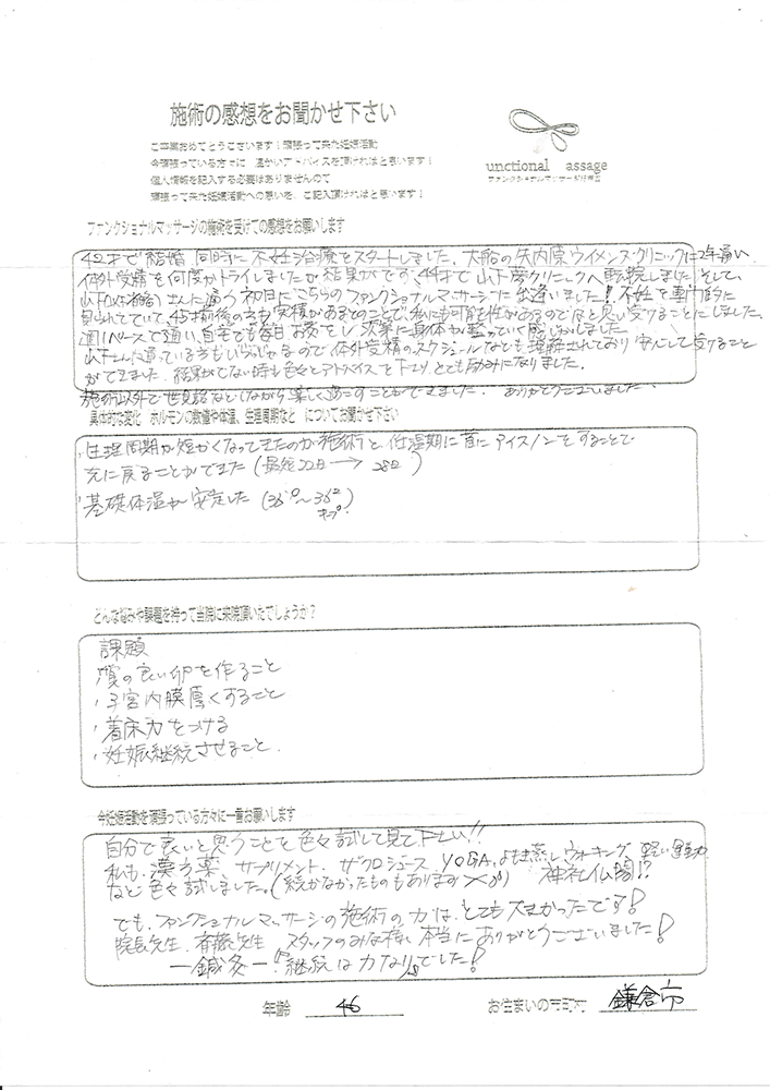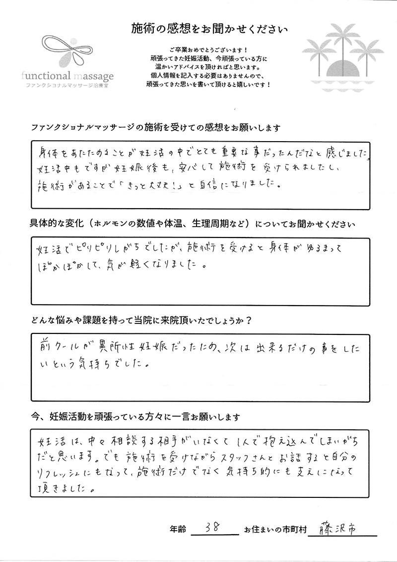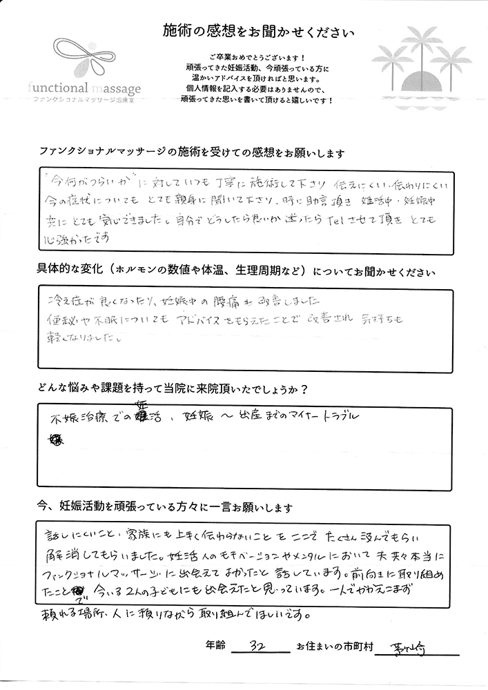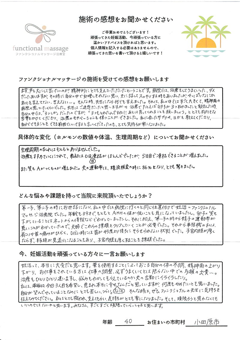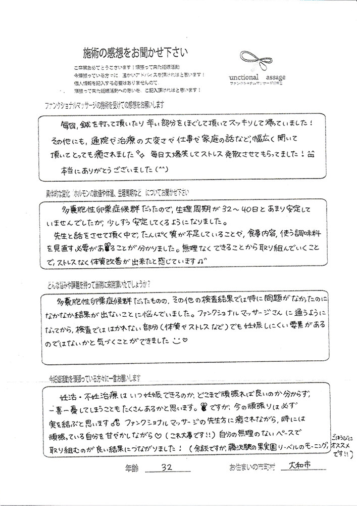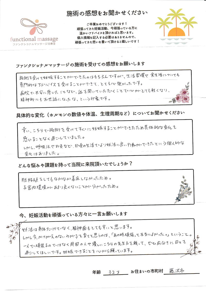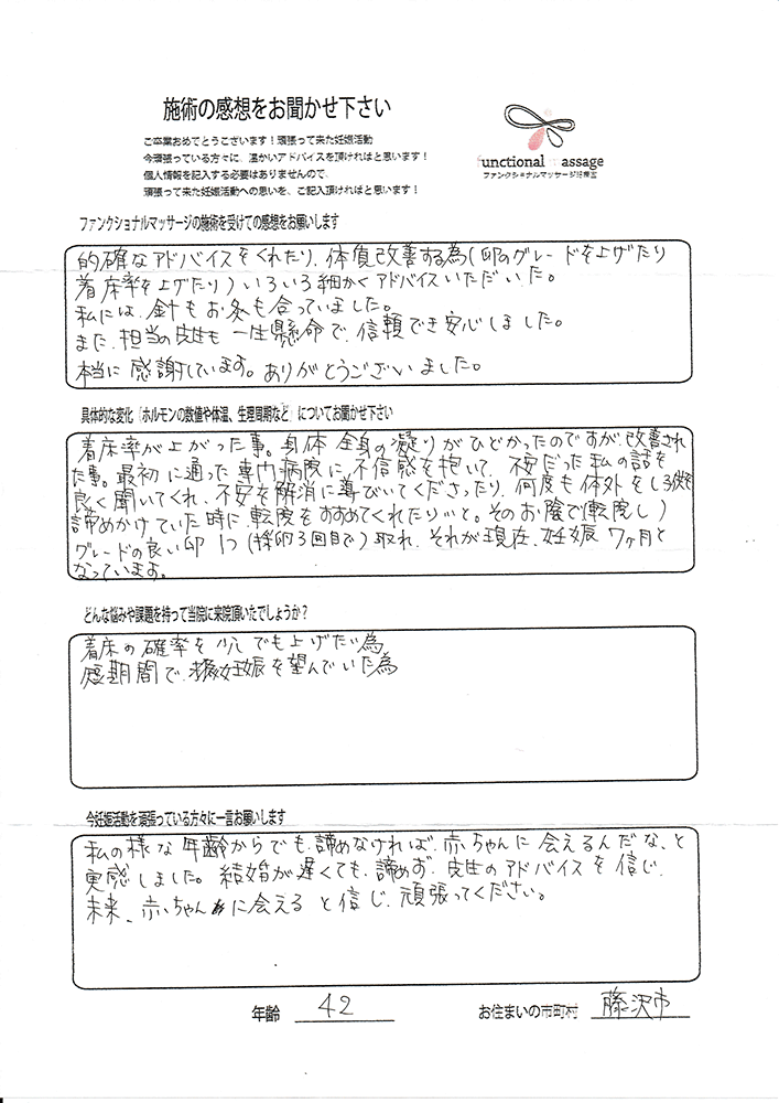 41歳での自然妊娠ですが、一度流産も経験しており、毎月また生理きたのねという日々もありました。うまくいくことばかりではありませんがファンクショナルマッサージの皆さんにはいつも明るく優しく接してもらい、とにかくここに来ると前向きな気持ちやリラックスした時間を過ごせるので私の妊活には絶対に必要な場所でした。
