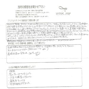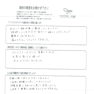 数値的なところではなかなか理想の形にはなりませんでしたが、施術の度に身体は楽になりましたし、便秘、冷え性がだいぶ改善されました。