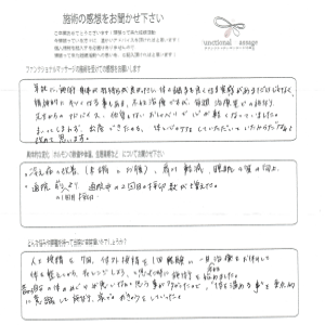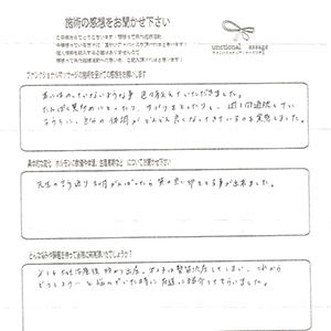 身体の不調なども施術のたびに確認してくださり、帰る時には改善されているので大変助かりました。