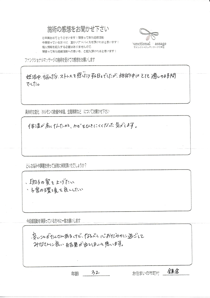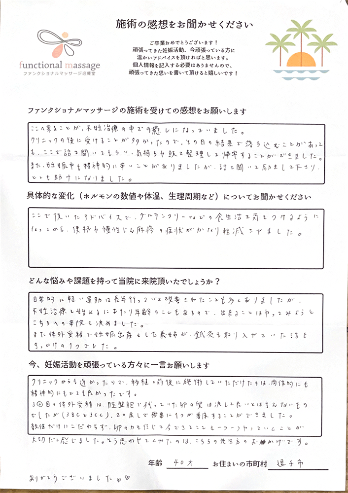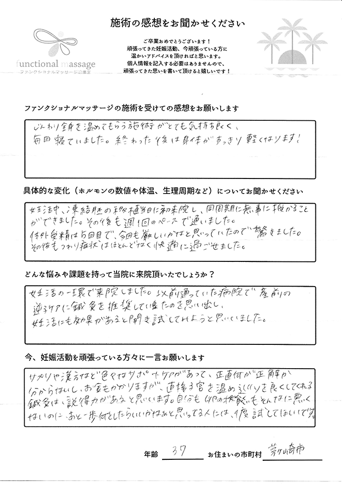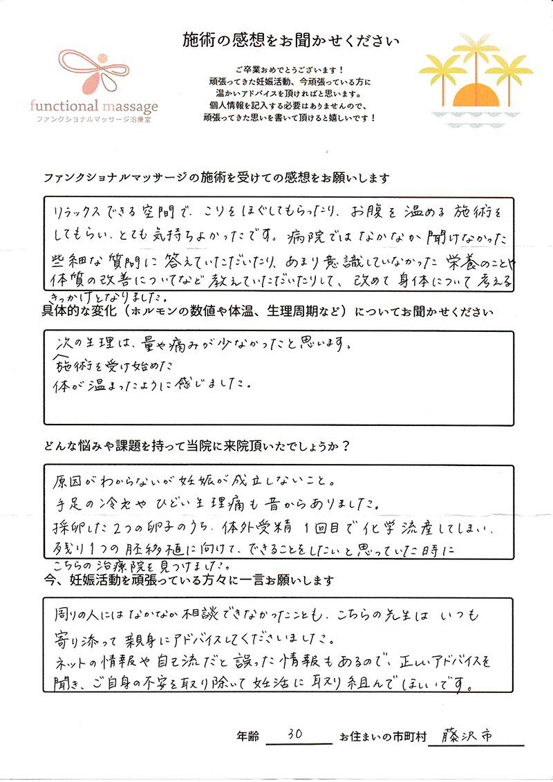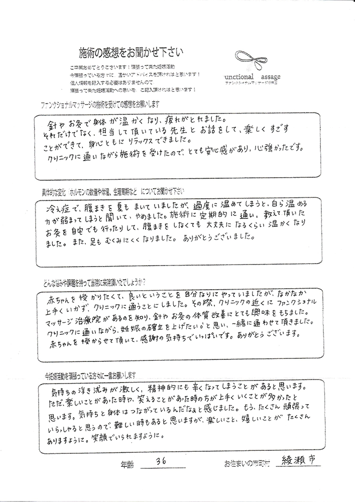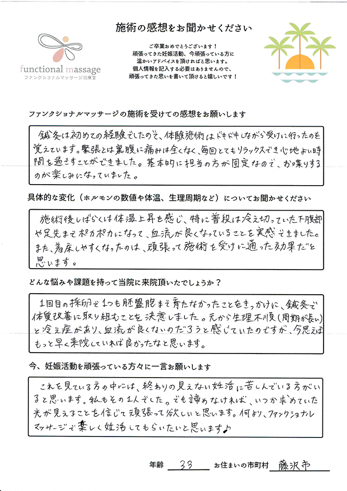 スタッフの方もポジティブに状況を受け止めてくれて、毎回楽しく通うことが出来ました。子宮を温めることで血の巡りが良くなったと思います。