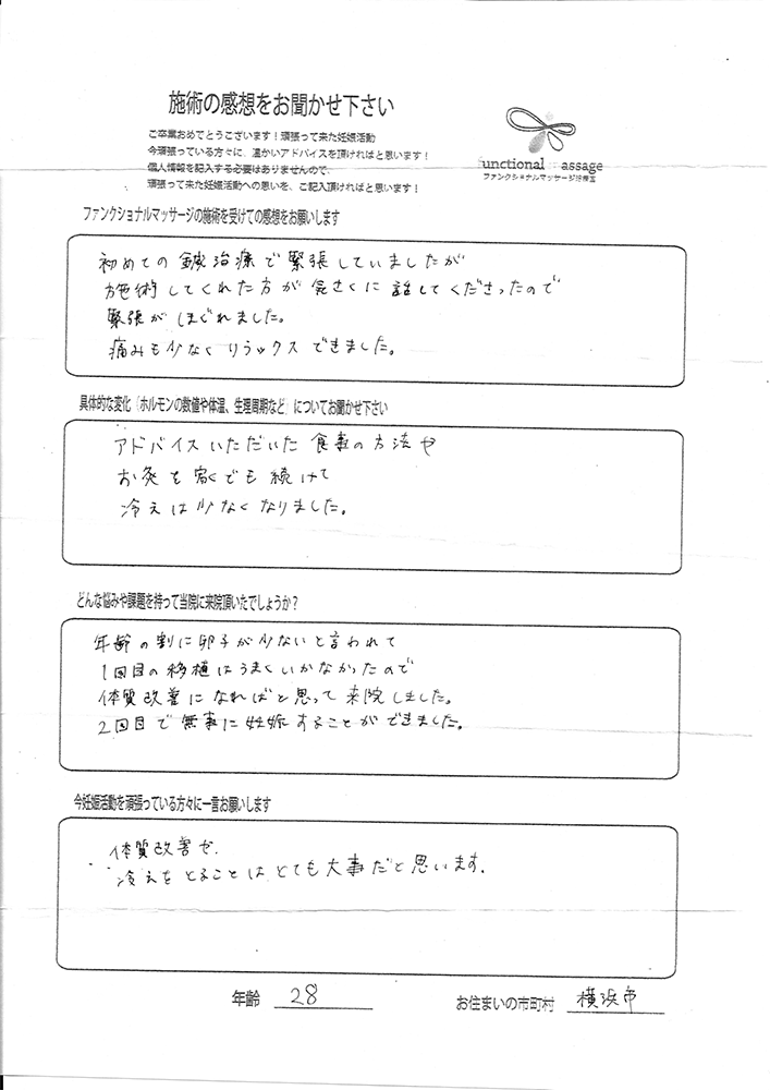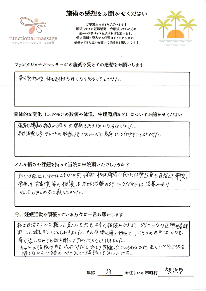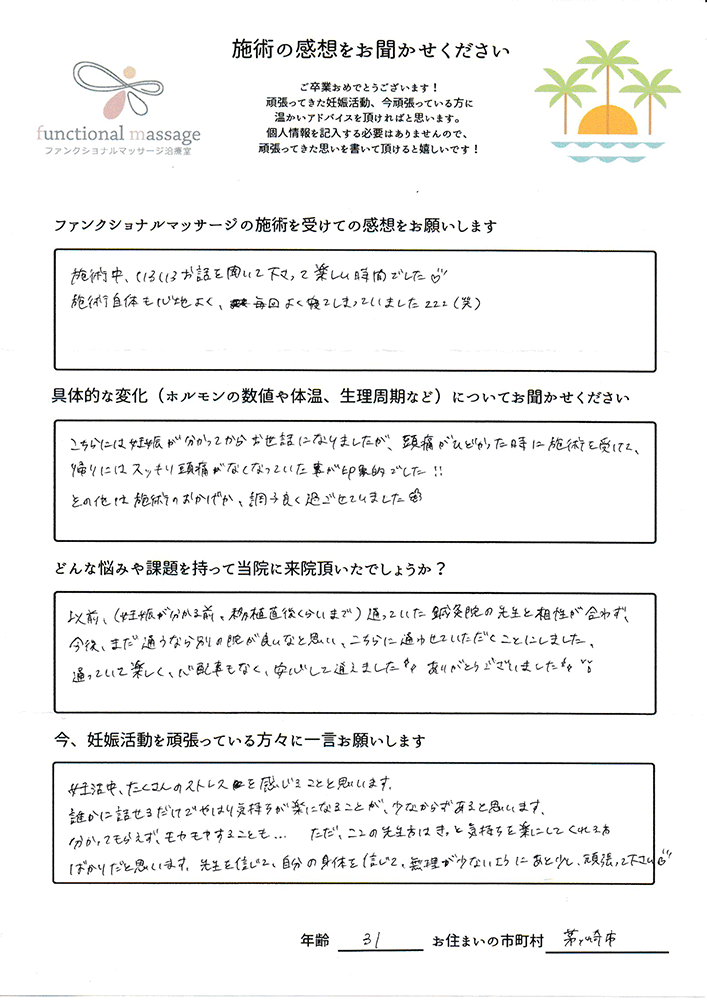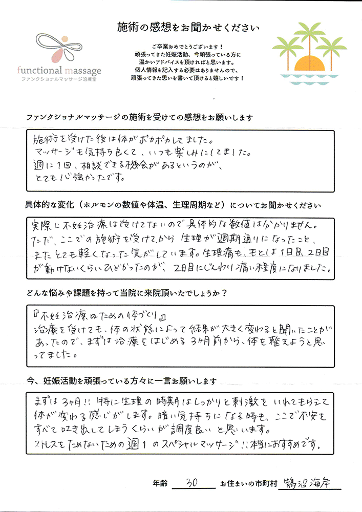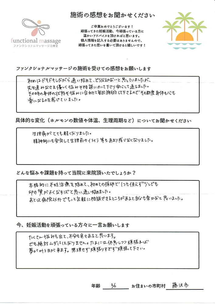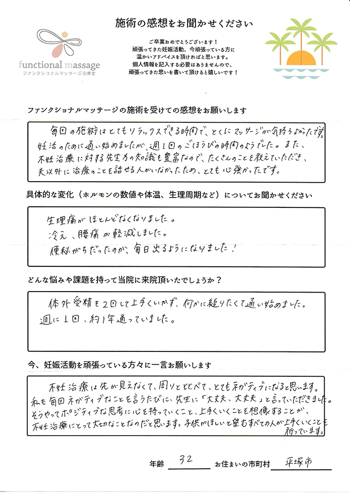 スタッフの方もポジティブに状況を受け止めてくれて、毎回楽しく通うことが出来ました。子宮を温めることで血の巡りが良くなったと思います。