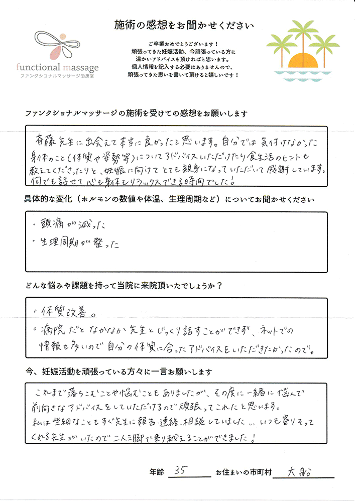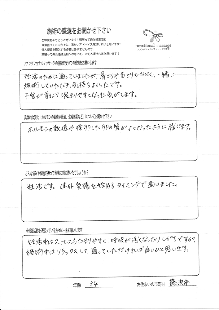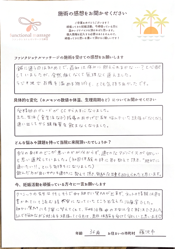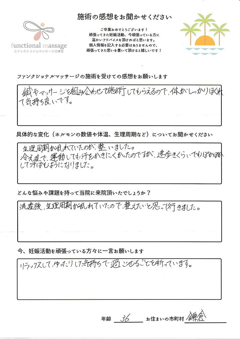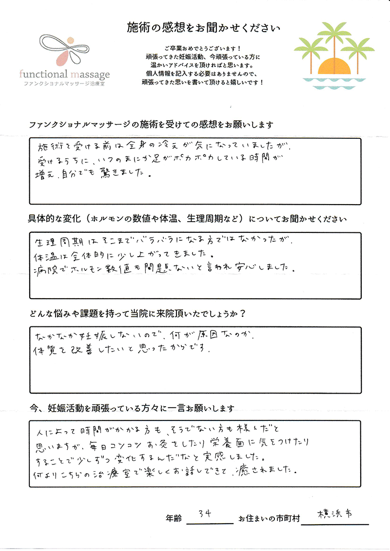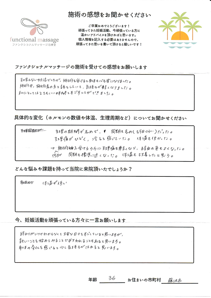 スタッフの方もポジティブに状況を受け止めてくれて、毎回楽しく通うことが出来ました。子宮を温めることで血の巡りが良くなったと思います。