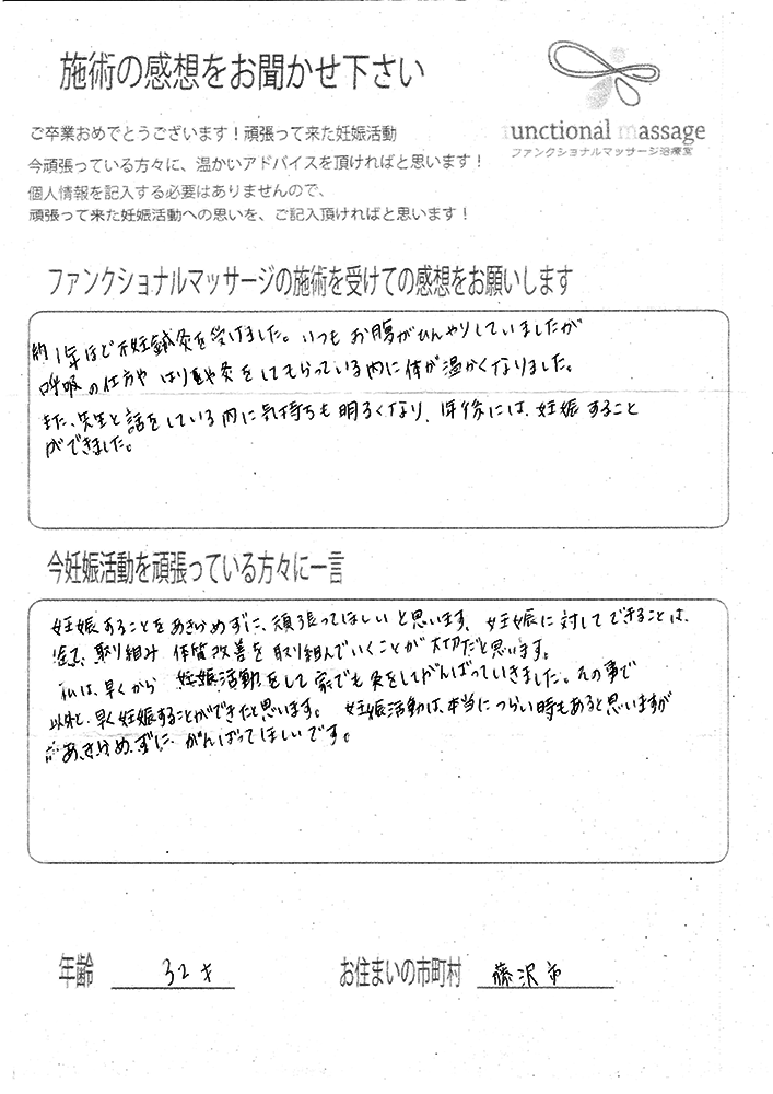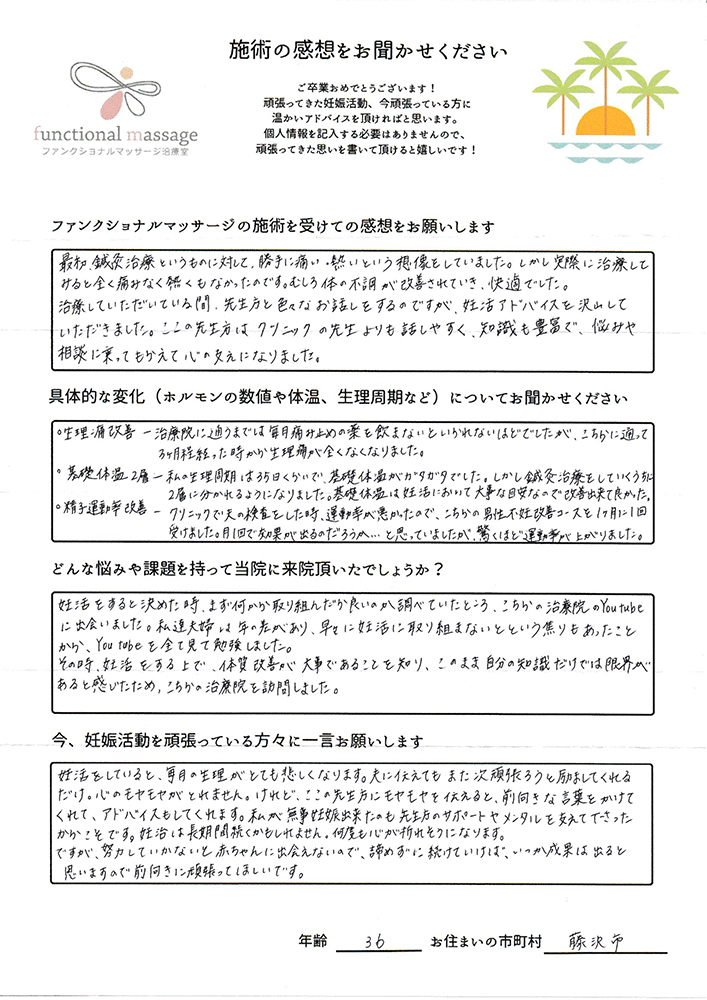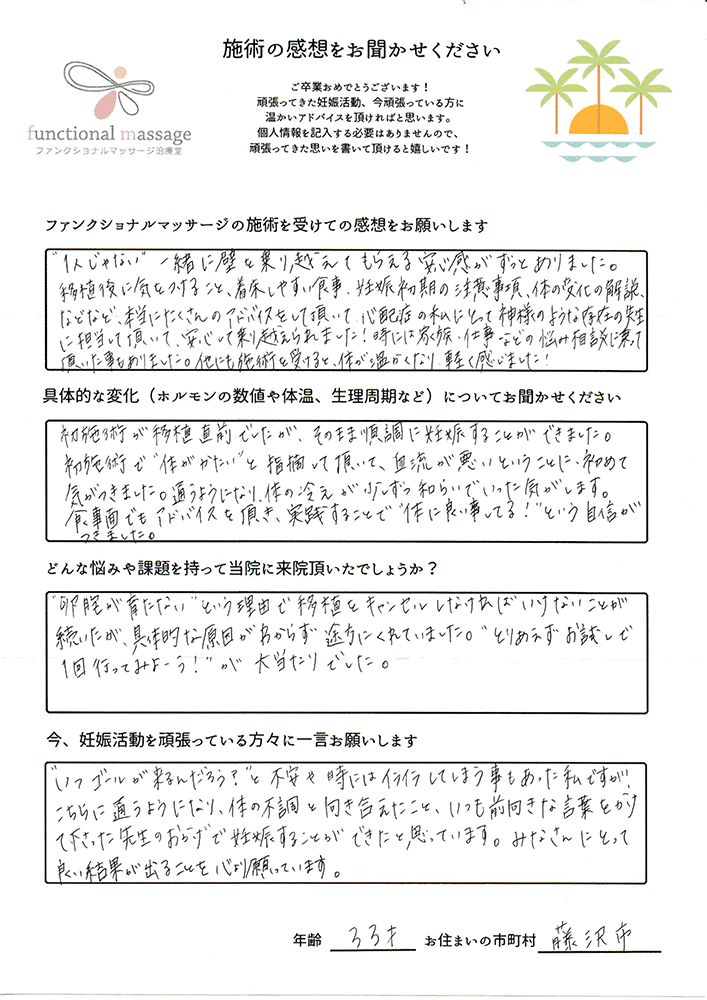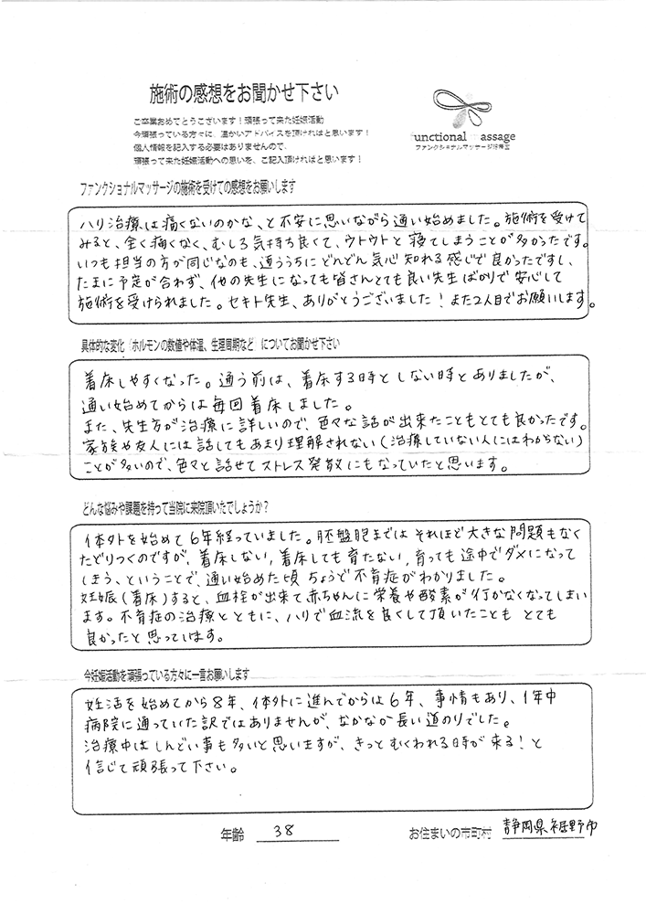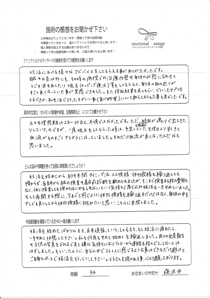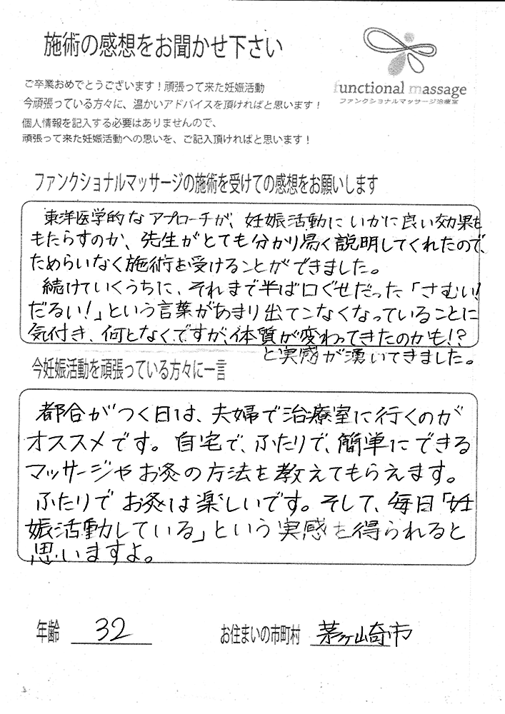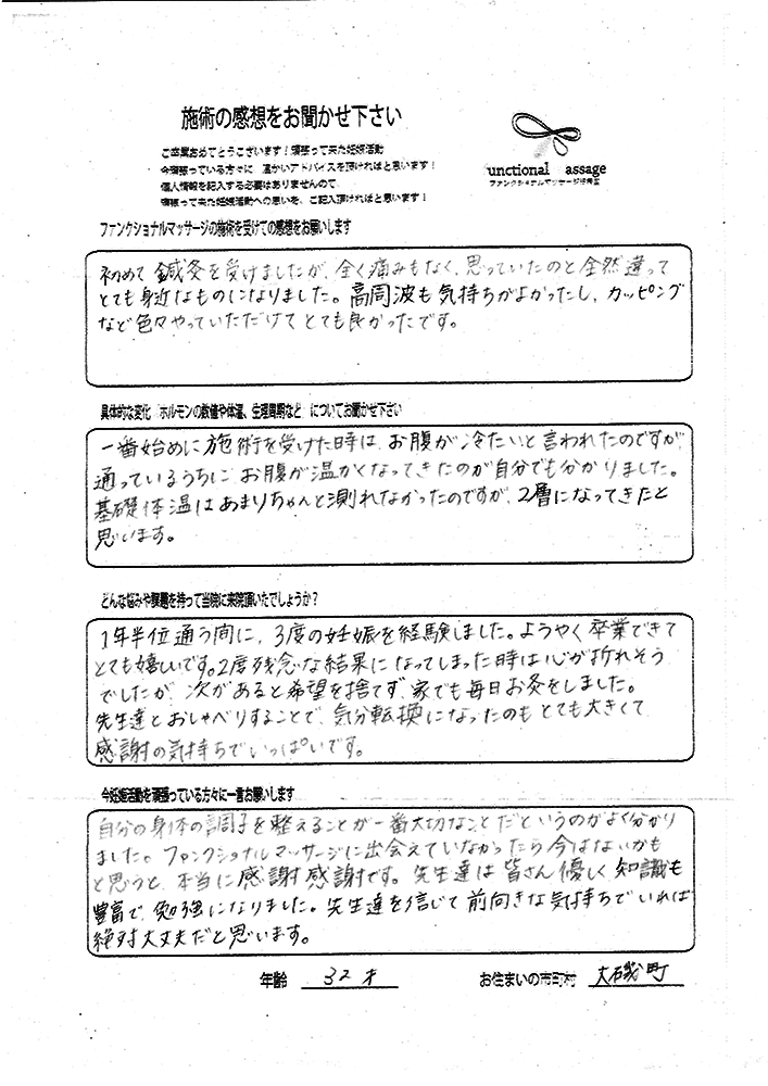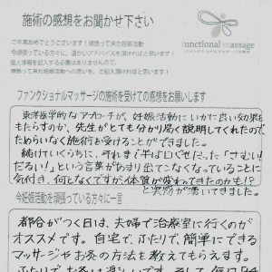 ファンクショナルマッサージ は妊活に絶対必要な場所だと思ってます。先生の言う事をよく聞いて自宅でお灸を続ける事で妊娠というゴールはとても近くなるハズです。あきらめず前向きに楽しく妊活できるよう応援しています!