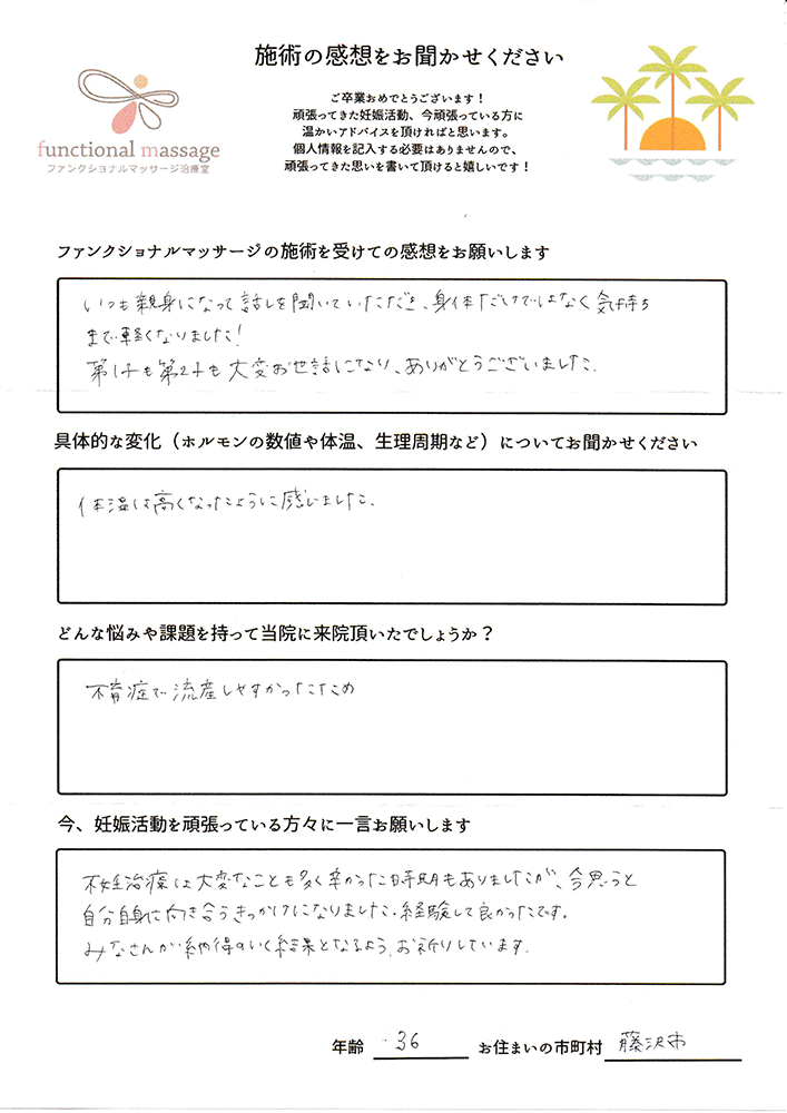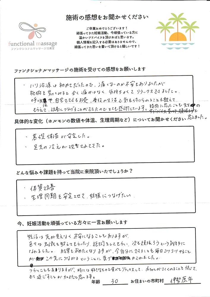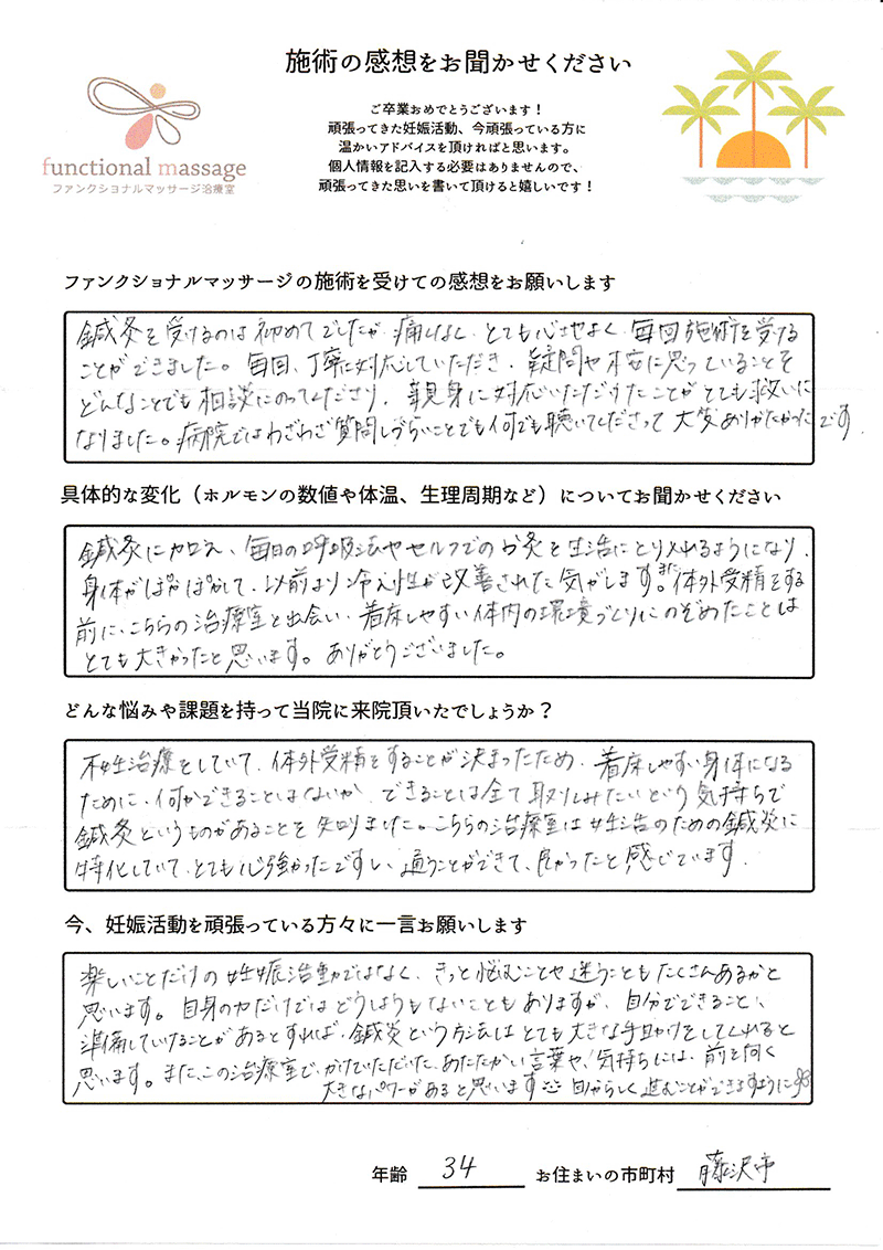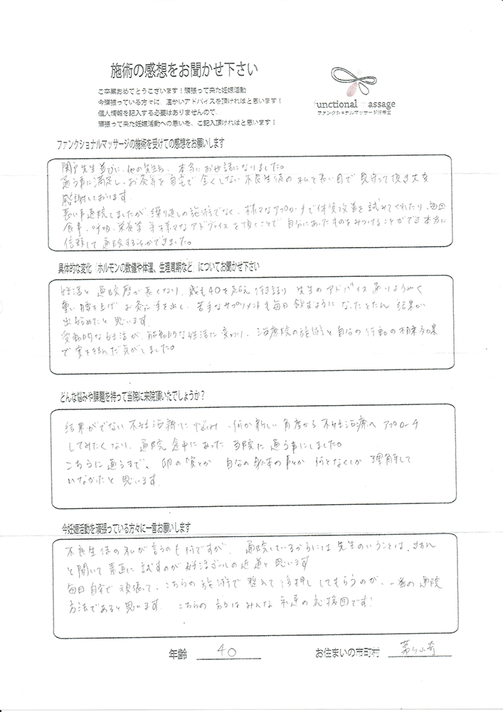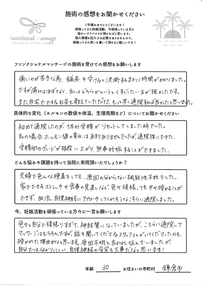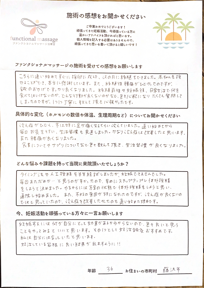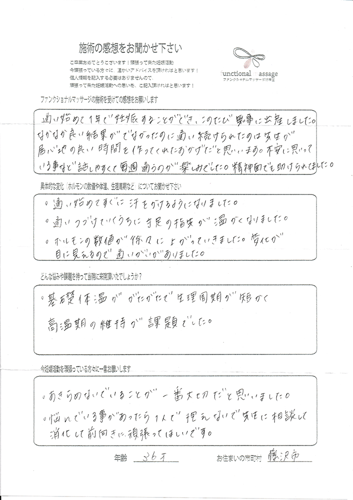 ファンクショナルマッサージ は妊活に絶対必要な場所だと思ってます。先生の言う事をよく聞いて自宅でお灸を続ける事で妊娠というゴールはとても近くなるハズです。あきらめず前向きに楽しく妊活できるよう応援しています!
