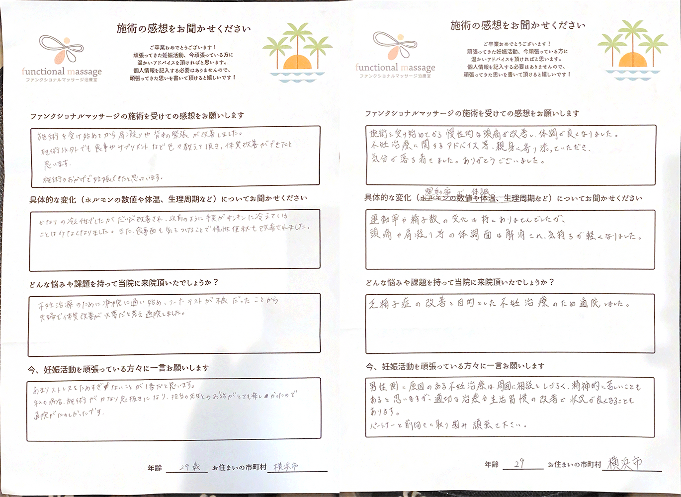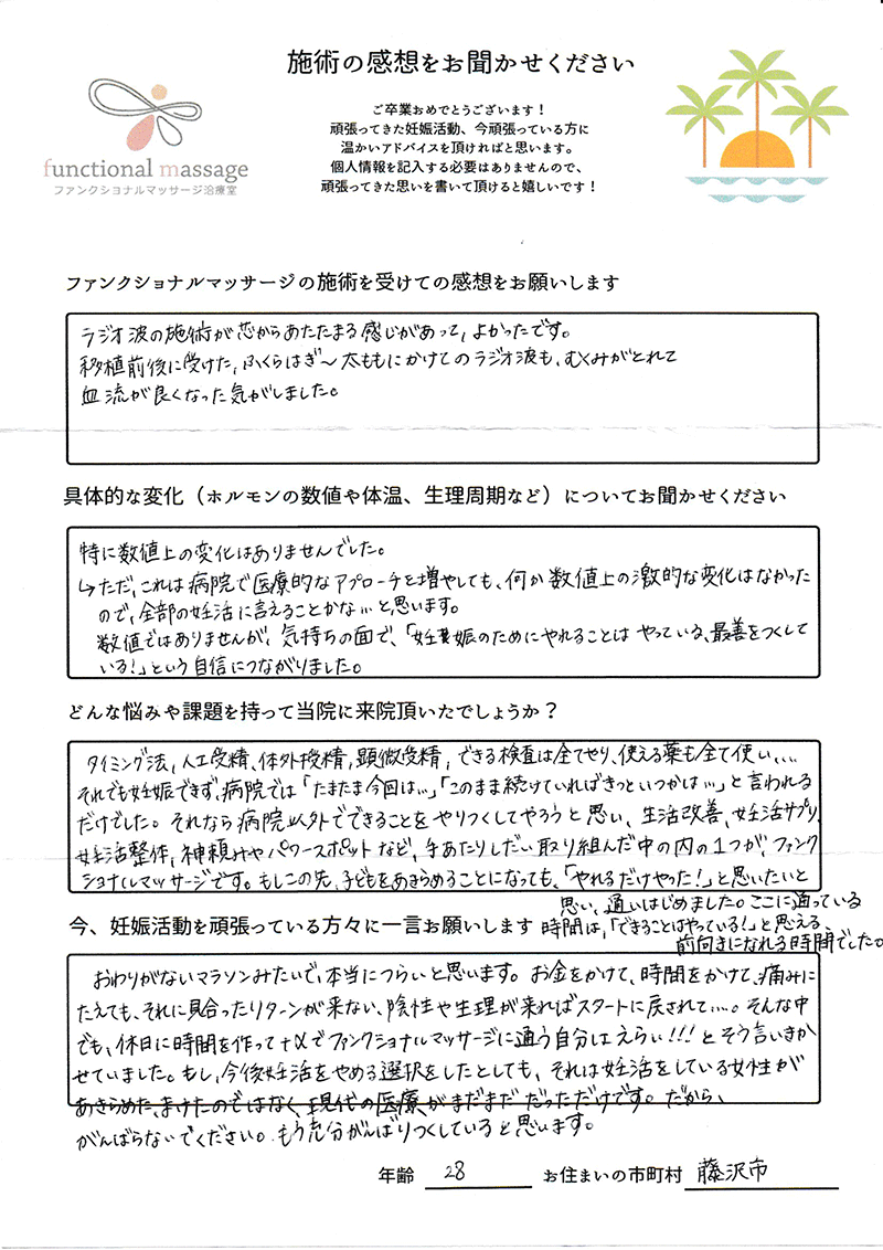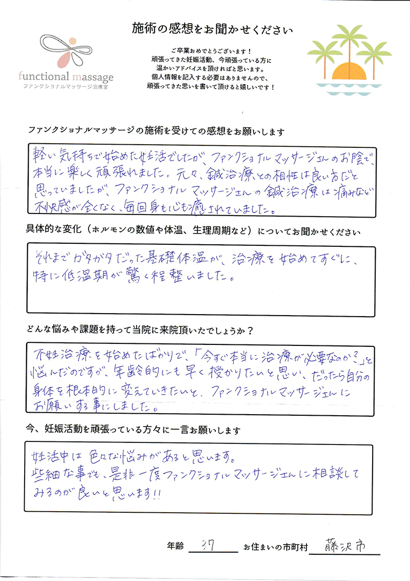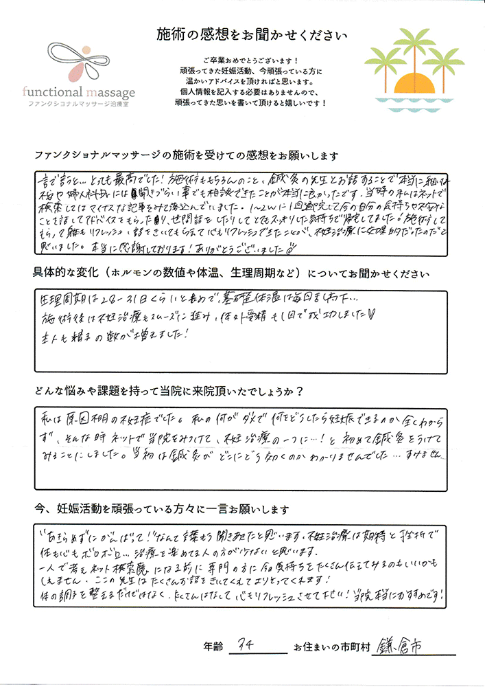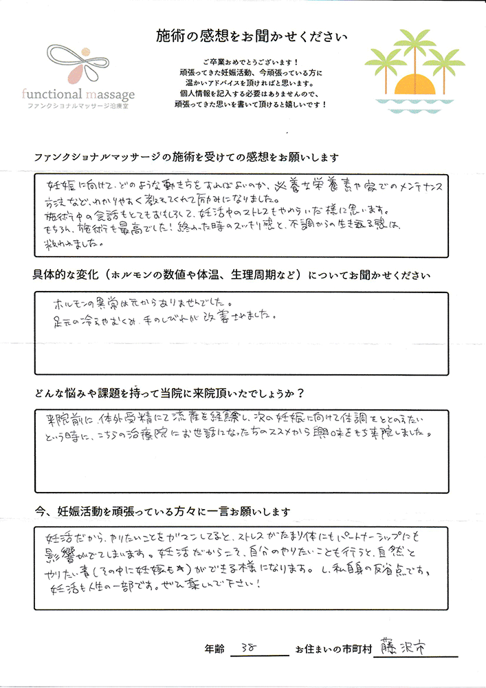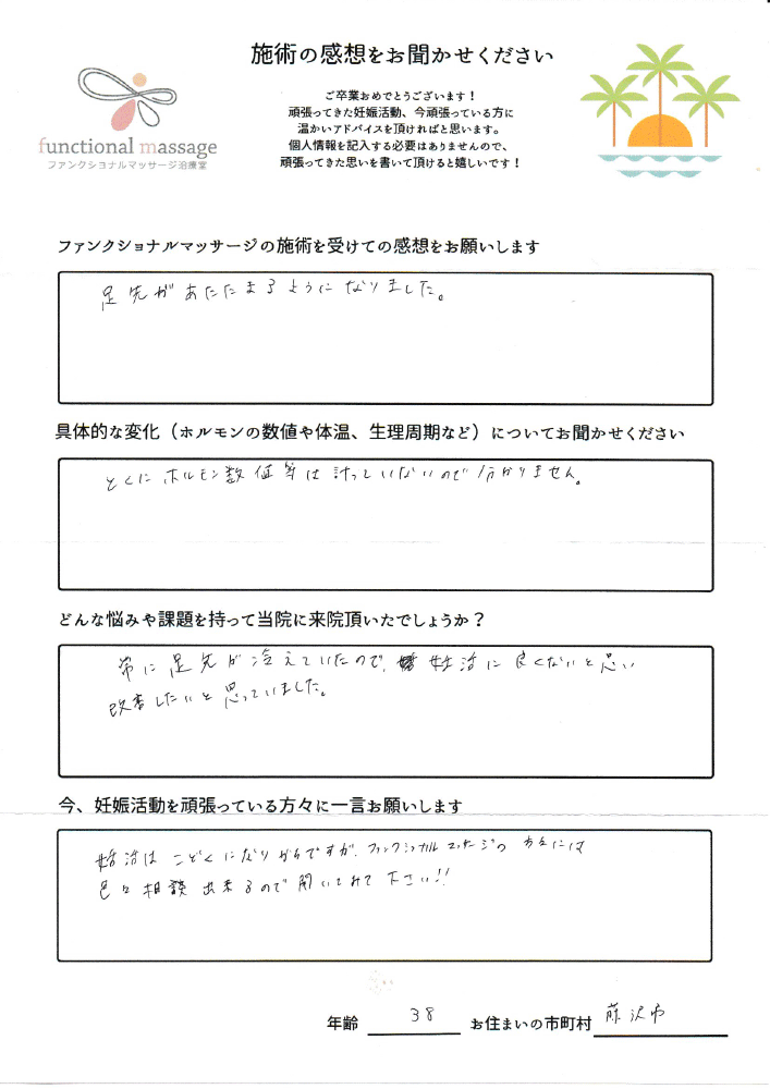 ファンクショナルマッサージ は妊活に絶対必要な場所だと思ってます。先生の言う事をよく聞いて自宅でお灸を続ける事で妊娠というゴールはとても近くなるハズです。あきらめず前向きに楽しく妊活できるよう応援しています!