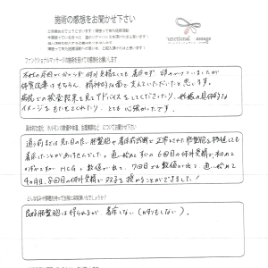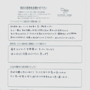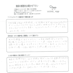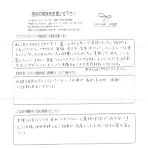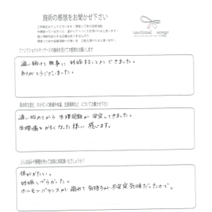 子宮内膜症ではありましたが、それ以外は特に問題ないとして病院からは言われていましたが、まず自分にとっては、体をリラックスすること、循環を良くすることが大事かと思い施術をして頂きました。