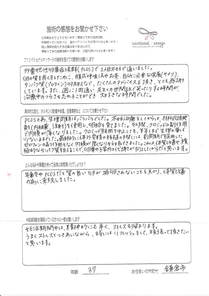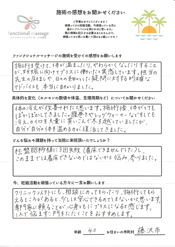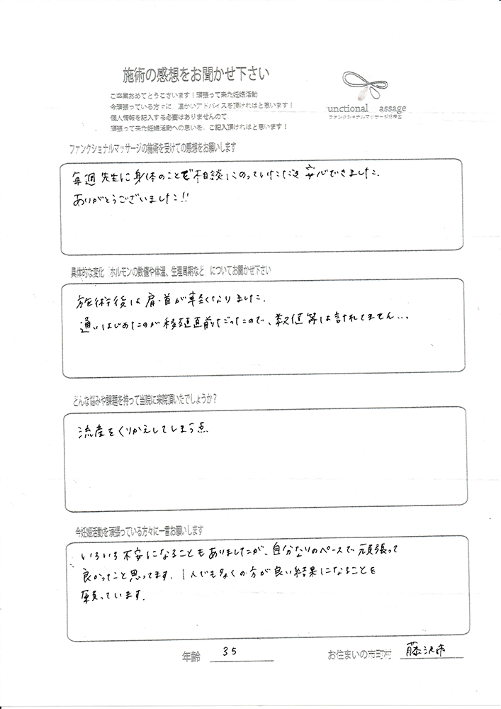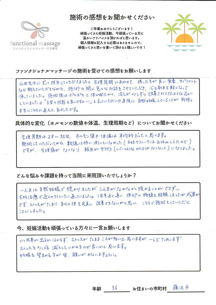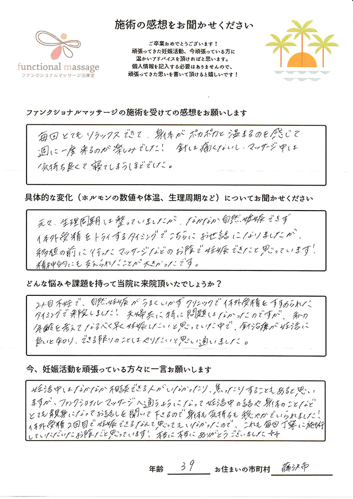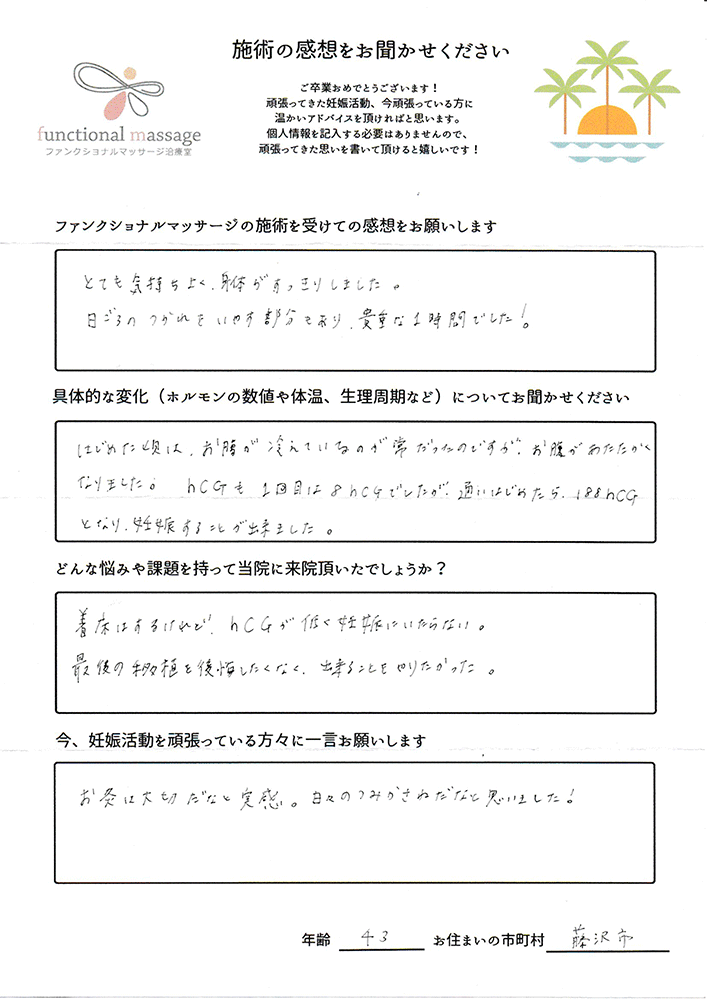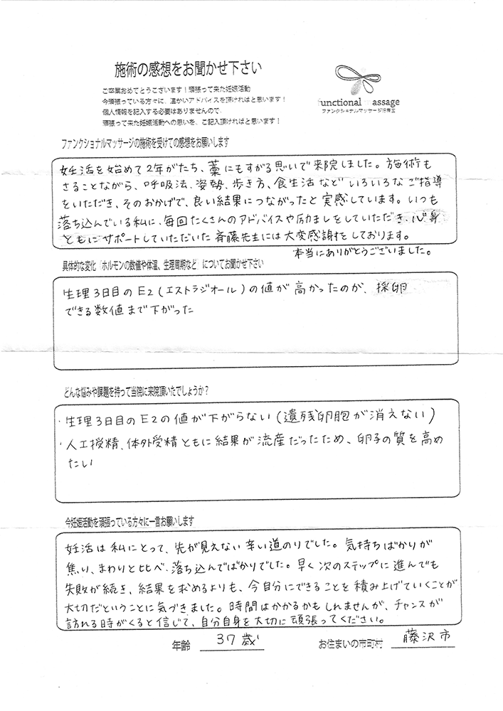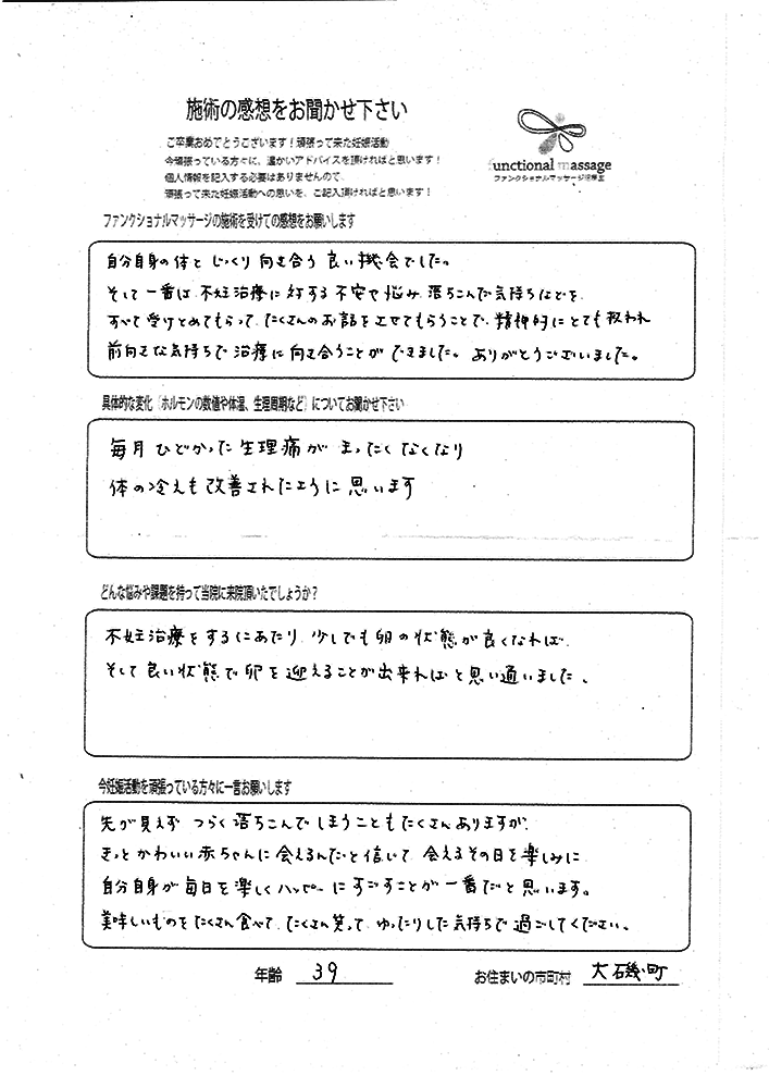 絶対妊娠する!!という気持ちとストレスフリーで生活し、ファンクショナルマッサージの皆さんにもたくさん協力してもらって頑張って下さい。