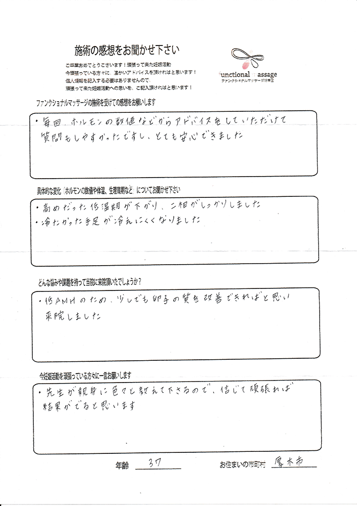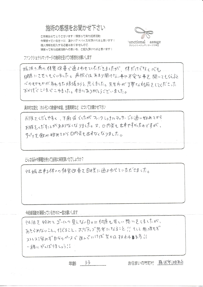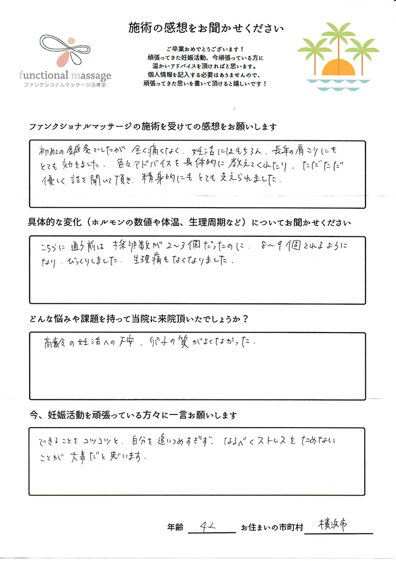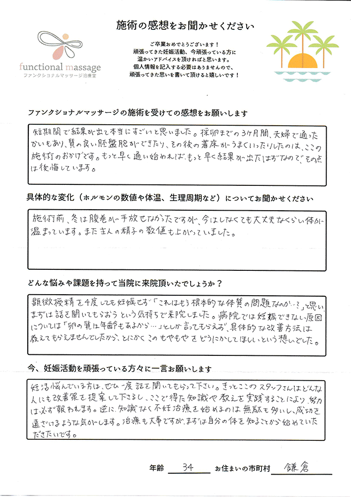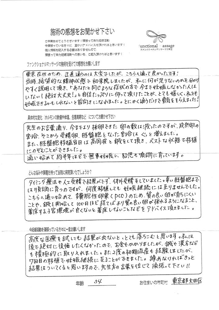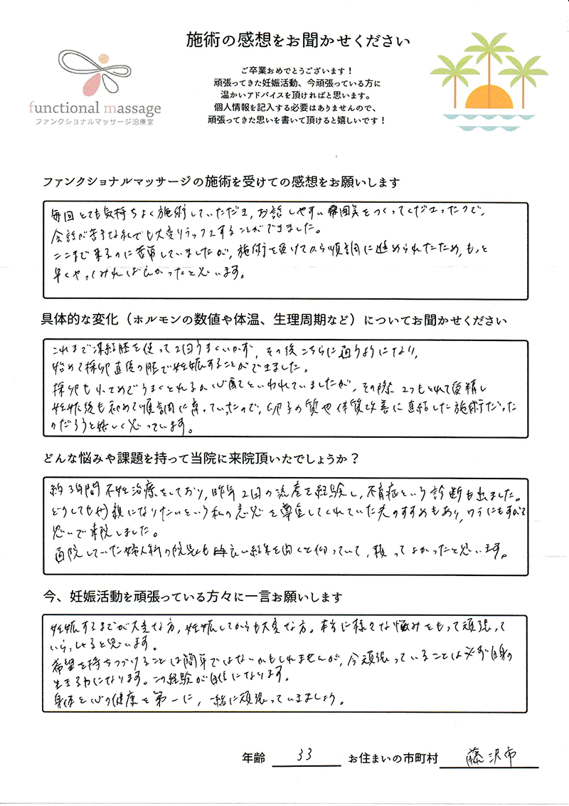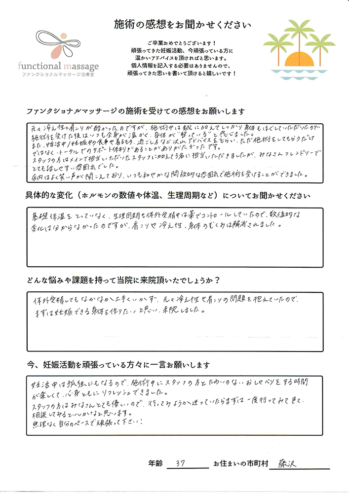 絶対妊娠する!!という気持ちとストレスフリーで生活し、ファンクショナルマッサージの皆さんにもたくさん協力してもらって頑張って下さい。