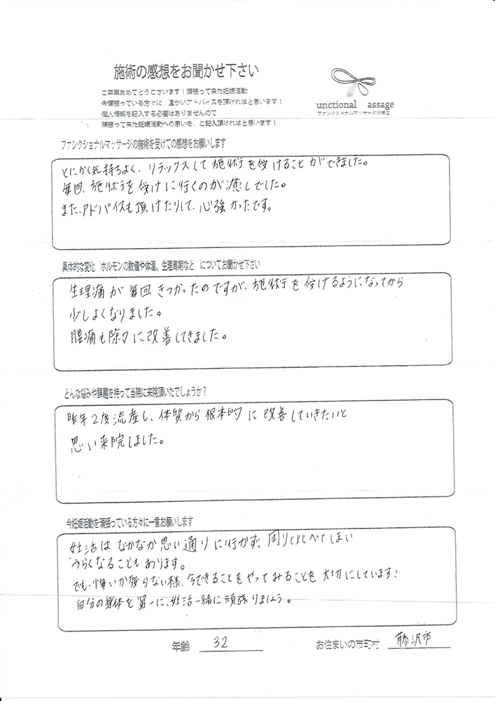 ・流産(初期)を2度程したので、こちらの施術で何か改善されたらと思い来院しました。