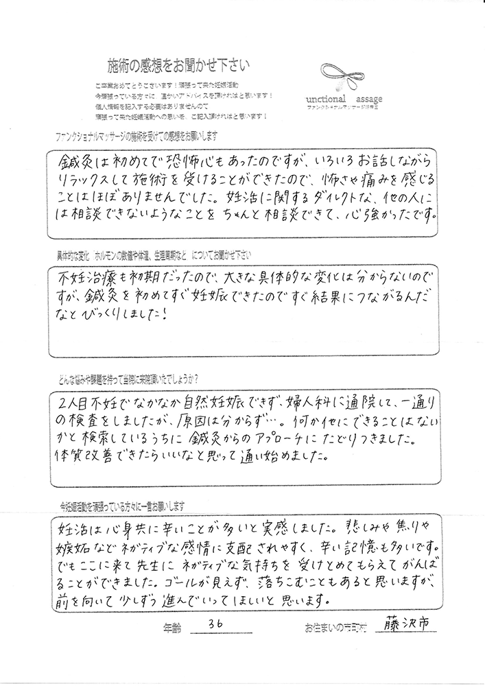 2人目が欲しくて妊活をしていましたが、3度の流産を経験してしまい、病院の検査でも異常がなかったので、あとは自分のやれる事は何だろうと考えた時にこちらを見つけ、来院しました。