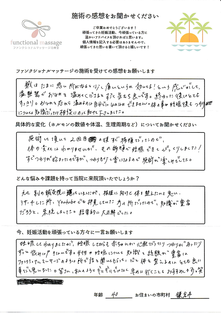 ・移植の前後で施術をして下さったのがとてもありがたかったですし、効き目があったと思います。