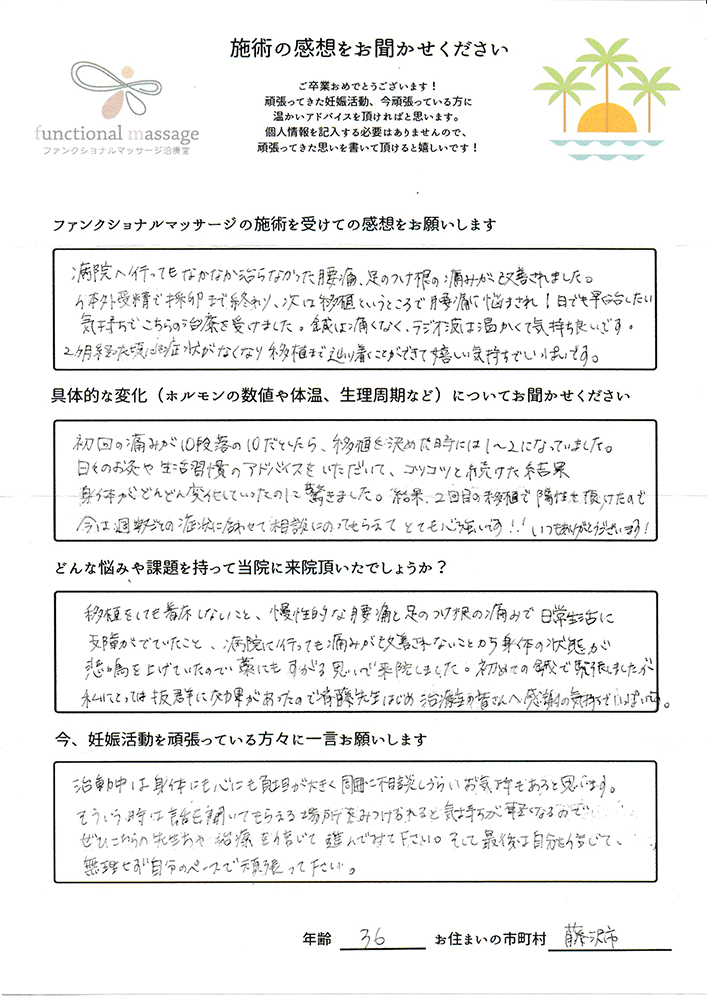 移植前後にも施術をしていただきとても感謝しています。
