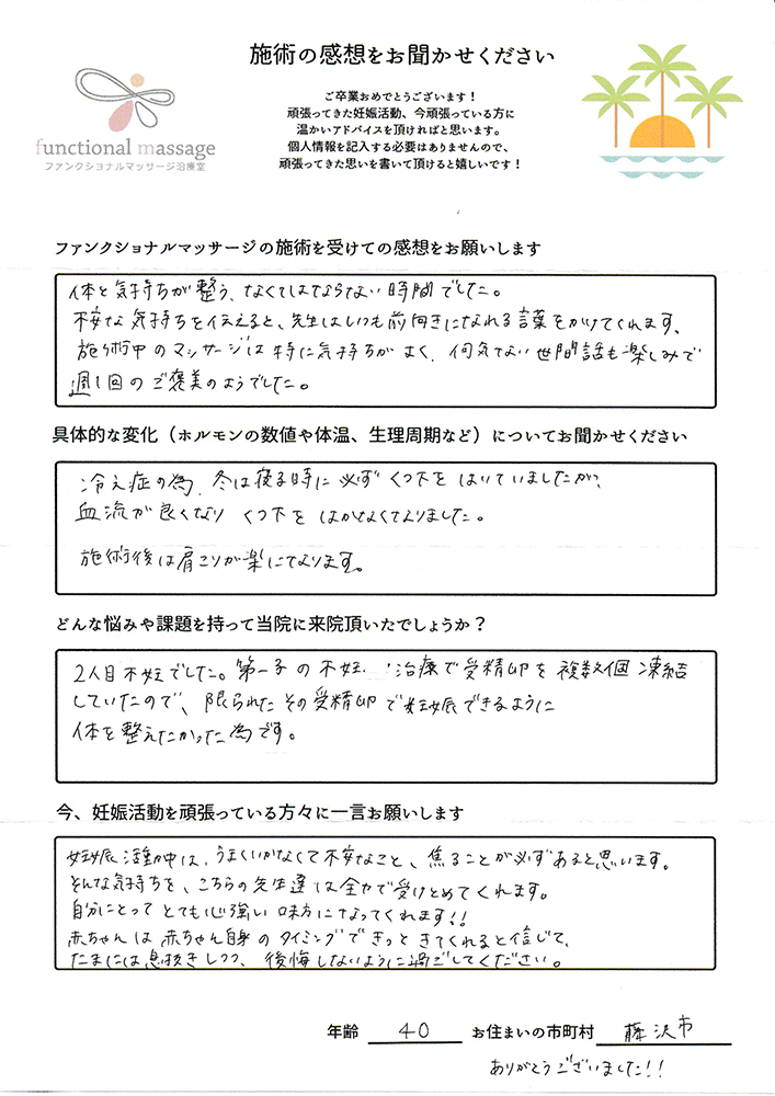 2人目では移植周期からでしたので、少しでも体を温めたり血液のめぐりを良くできればと思い通わせて頂きました。本当にありがとうございました。